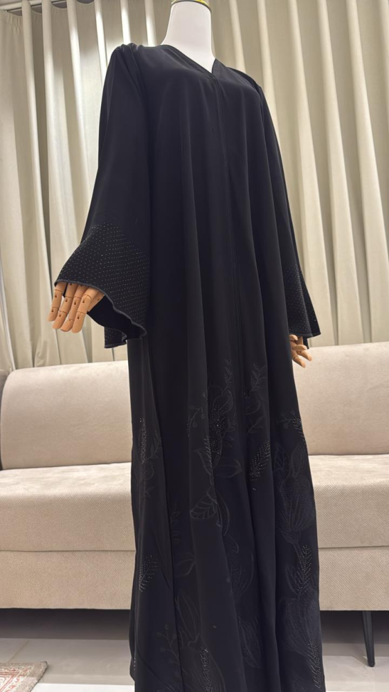 عبايات سوداء انيقة كريب كوري ملكي تمنحك إطلالة استثنائية تمزج بين الفخامة والنعومة بفضل تطريز الخيوط المتقن مع بريق الفصوص الناعم لتتألقي بجمال فرنسي عصري يعكس رقي ذوقك الفريد في كل وقت للمزيد زوروا موقعنا